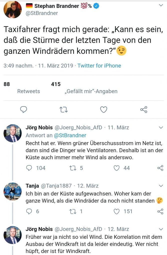 Die AfD als ultraneoliberale Partei des Establishments ist natürlich knallhart gegen erneuerbare Energien. Um nun ihre Anhänger hier auch auf Linie zu bringen, werden dann eben solche absurden Behauptungen wider besseres Wissen aufgestellt.