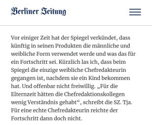 Zudem habe ich den Eindruck, dass derartige identitätspolitische Maßnahmen oft als eine Art Feigenblatt fungieren. Ein schönes Beispiel, wie nämlich die Verwendung gendergerechter Sprache nicht zu einer Änderung im patriarchalischen Denken führt, hat kürzlich die Berliner Zeitung in einem Posting, das ich auf der Facebook-Wall von Fabio de Masi (Linke) entdeckt habe, geschildert:
