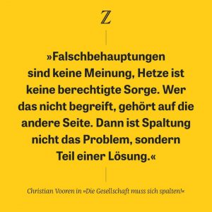 Und was nun noch hinzukommt: Auch wenn die Nichtgeimpften häufig zu rechten und rechtsextremen politischen Ansichten tendieren (s. hier), so sind die doch beileibe nicht alle so drauf, sondern haben durchaus unterschiedliche Gründe, sich nicht gegen Covid-19 impfen lassen zu wollen. Es sind also nicht alles Menschen, die grundsätzlich gegen einen zivilisierten, demokratischen und rechtsstaatlichen Gesellschaftskonsens verstoßen, sodass hier eine Ausgrenzung schon nicht angebracht wäre, eine Spaltung erst recht nicht.