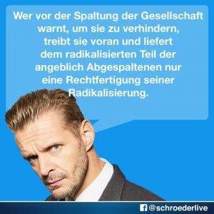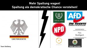 Ich bin ja auch der Ansicht, dass man mit Rechtsradikalen nicht diskutieren kann und muss (s. dazu auch hier und hier), würde aber dennoch nie den Begriff „Spalten“ verwenden, um das zu kennzeichnen. Das wäre m. E. allein schon aufgrund des damit zusammenhängenden Framings fatal. „Ausgrenzung“ wäre hier der passendere Begriff.