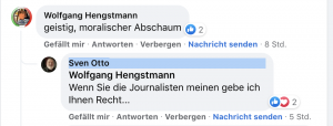 Letzteres habe ich gerade erlebt, als auf der Facebook-Seite Mensch und Politik heute ein Artikel vom Tagesspiegel, in dem es um tätliche Angriffe auf Journalisten am Rande einer Querdenker-Demo ging, diskutiert wurde. Da wurde dann nicht nur vonseiten derjenigen, die sich anscheinend selbst zu den Querdenkern zählen, relativiert, sondern auch ganz offen Zustimmung geäußert, und das unter Klarnamen, so wie beispielsweise hier: