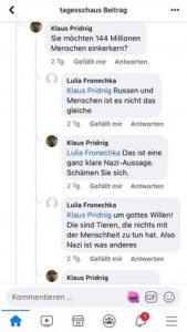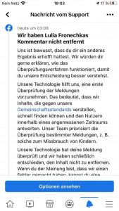 Wie sehr diese Schwarzweißsichtweise medial unterstützt wird, wird gerade sehr deutlich bei Facebook. Da werden gern mal Kommentare in dem jemand von „den dusseligen Deutschen“ als Allgemeinplatz schreibt als Hassrede klassifiziert und dann gelöscht. Andererseits darf so was dann stehen bleiben, was neulich einen Freundin von mir dokumentierte, die übrigens auch die Beschwerde bei Facebook wegen der Aussagen von Lulia Fronechka eingereicht hat: