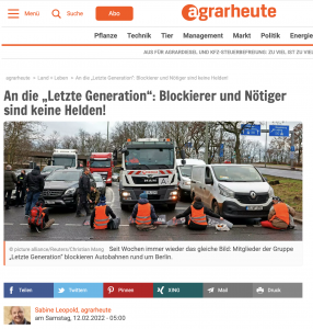 Als Letztes dann noch das „Sahnehäubchen“, was auf das Ganze noch mit draufkommt. Im Februar 2022 fand sich ein Kommentar von Sabine Leopold auf der Landwirtschaftsplattform agrarheute – zum Thema Klimaaktivisten und deren Straßenblockaden.