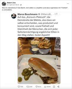 Dass Buschmann dann auch noch von „Freiheit“ schwafelt, darf bei der FDP nun mal nicht fehlen, darauf ist deren unterbelichteter Anhang ja auch getrimmt worden, und immerhin ist es ja der Markenkern dieser Marktfaschisten, dass sie den wunderbaren Begriff „Freiheit“ reichlich pervertiert haben, sodass er nur noch im Sinne eines plumpen Recht des Stärkeren verstanden wird. Gut, zu einem komplexeren Verständnis sind FDP-Wähler vermutlich auch gar nicht in der Lage …