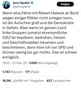 Allein schon „wegen einiger Pöbler“ – was für eine untertriebene Beschreibung des gewaltbereiten, aufgehetzten und in Teilen rechtsextremen Mobs, der damals am Anleger auf Robert Habeck wartete. Und dann sollte man noch berücksichtigen: Demonstranten, die für die Demokratie und gegen Faschismus protestieren, sind etwas anderes als ein Mob, der mit Demokratie nichts am Hut hat und einem gewählten Politiker einer demokratischen Partei ans Leder wollen. Das Einzige, was hierbei schwer erträglich ist, ist mal wieder die Realitätsverzerrung von Jens „der großen Masken-Dealer“ Spahn. Aber wenigstens zeigt er so, dass er mit den rechtsextremen Spinnern, die Habecks Fähre nicht anlegen ließen, doch eher sympathisiert als mit aufrechten Demokraten. Konnte man sich zwar bei Spahn so auch schon vorher denken, aber nun ist das wenigstens mal glasklar von ihm selbst ausgesprochen worden.