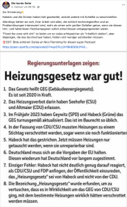 Oder auch die Nummer mit dem sogenannten Heizungsgesetz, eigentlich Gebäudeenergiegesetz, aber das wurde ja schnell aufgrund des zur plumpen Stimmungsmache griffigeren Titels so bezeichnet. Dazu muss man eigentlich nicht viel mehr wissen als das, was ich auf der Facebook-Seite „Die bunte Seite“ gesehen habe: