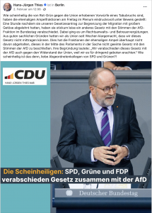 Eine andere Form der Legitimierung des CDU-Verhaltens bei den Abstimmungen mit der AfD zusammen fand sich dann in Form eines Facebook-Postings des CDU-Hinterbänklers Hans-Jürgen Thies: