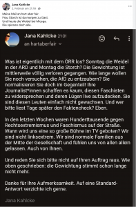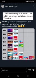 Wie schon seit Längerem wird hier also das Thema Migration als Nebelkerze genutzt, um von anderen Missständen abzulenken. Was ich dazu in einem Artikel vom letzten Oktober geschrieben habe, gilt leider nach wie vor – und wird immer rabiater und offensichtlicher von der CDU so praktiziert. Stets natürlich unter diensteifriger Mithilfe vieler Medien, gerade auch der öffentlich-rechtlichen (s. hier). Das spiegelt sich gerade auch darin wieder, wie nun vonseiten von ARD und ZDF auf die ganze Sache und den darauf stattfindenden Protest mit großen bundesweiten Demonstrationen gegen Rechts reagiert wird. Dazu ein paar Facebook-Fundstücke: