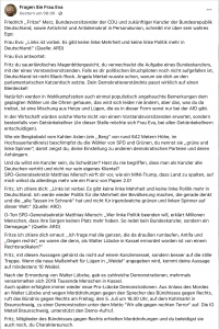 Auch die Witwe von Walter Lübcke zeigt sich wenig begeistert darüber, dass Merz ihren ermordeten Gatten auf so widerwärtige, obszöne Weise für plumpe Stimmungsmache und Hetze im Wahlkampf instrumentalisiert (s. hier).