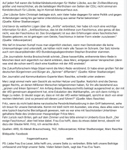So behauptete Merz in einer Wahlkampfrede im Münchner Löwenbräukeller doch glatt, nach der Ermordung seines Parteikollegen Walter Lübcke durch einen Rechtsextremen hätte niemand gegen Rechts demonstriert (s. hier die Aussage in einem Reel auf Facebook) – was schlichtweg nicht stimmt. Die Facebook-Seite „Fragen Sie Frau Eva“ hat dazu eine passende Antwort geschrieben – etwas länger zwar, aber es lohnt sich, das zu lesen: