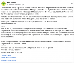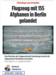 Und Merz ist da ja nun nicht der einzige Lügner, sondern die Lüge ist grundsätzlich Programm bei der CDU, wie gerade auch wieder Thorsten Frei, der wohl auch unter Merz einen Ministerposten bekommen dürfte, bewiesen hat. Hans Meiner fasst auf seiner Facebook-Wall treffend zusammen, wie Frei in bester AfD-Manier zusammen mit der BILD mit Falschaussagen Stimmung gegen Geflüchtete und die Grünen gleichzeitig macht: