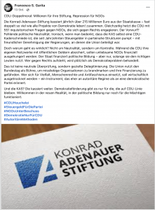 Denn worauf man sich einstellen kann, sieht man ja jetzt schon: Da wird mal eben eine kleine Anfrage der CDU eingebracht, die grundsätzlich alle zivilgesellschaftlichen Organisationen, die sich für Demokratie, Klima- und Umweltschutz sowie gegen Rechtsextremismus engagieren, die mit 551 Fragen zu deren Finanzierung offensichtlich nur das Ziel hat, Einschüchterung zu betreiben (s. hier). Dass vor allem die CDU selbst auch gern mit falschen Aussagen zur Finanzierung von NGOs, wie beispielsweise Campact (s. hier), aufwartet, passt da sehr gut ins Bild der antidemokratischen Unaufrichtigkeit.
