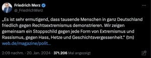Besonders deutlich wird die Doppelzüngigkeit von Merz, wenn man sich anschaut, was er noch ein Jahr zuvor in den sozialen Medien gepostet hat zu den Demonstrationen gegen Rechts – aber da ging es ja auch vor allem gegen die AfD, von der er sich damals noch abzugrenzen versuchte, während er nun ja auf Kuschelkurs mit den Blaubraunen ist: