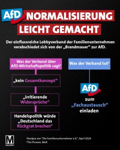 So hat gerade die Lobbyorganisation „Die Familienunternehmer e. V.“ (die vor allem von Großkonzernen dominiert wird, sodass der Name schon reichlich irreführend ist) verkündet, dass man doch nun auch die AfD gern mal zum „Fachaustausch“ einladen würde. Das ist vor allem auch deswegen interessant, weil man vonseiten dieses Verbands bisher der AfD stets komplett ökonomische Inkompetenz attestiert hat (hier gefunden):