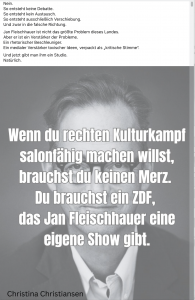 Apropos öffentlich-rechtliche Medien: Nachdem in der ARD ja immer noch Dieter Nuhr seine rechte Hetze als Komödiantentum präsentieren darf und extra für Rechtskonservative das Rumeplformat Klar eingeführt wurde, will das ZDF nun wohl auch nicht hintenanstehen und gibt doch tatsächlich dem Rechtsaußenschmierfinken Jan Fleischhauer (einfach mal zur Einschätzung den Bereich „Kontroversen“ seines Wikipedia-Profils durchlesen) eine eigene Sendung (s. hier). Und ganz überraschend wird dann das Thema der ersten Sendung natürlich sein: Migration.