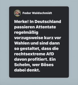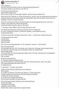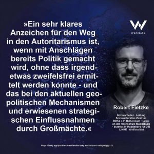 Leider verfängt so ein Müll aber bei vielen Leuten, sodass vermutlich kaum noch jemanden interessieren wird, was tatsächlich irgendwann mal bei den Ermittlungen rauskommen wird. Die Legende ist mal wieder gestrickt: Der Linksextremismus ist die größte Gefahr im Land. Alles andere ist Nebensache. Nur finden sich AfD, CDU und Co. dabei in nicht allzu guter Gesellschaft, wie ein Zitat von Robert Fietzke, dass Wemeze auf Facebook präsentiert, zeigt: