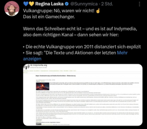Tja, und dann kommt noch hinzu, dass diejenigen, die sich selbst seit 2011 als Vulkangruppe bezeichneten, sich sowohl von dem Anschlag als auch von dem Bekennerschreiben distanzieren, wie ich zuerst in der Facebook-Gruppe „Lügen der AfD – Populistenwatch“ gelesen habe: