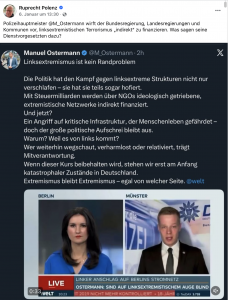 Das konnte man ja im letzten Jahr vor der Bundestagswahl auch schon beobachten, dass sich da auf einmal die Terroranschläge häuften. Und nun stehen halt bald einige sehr wichtig Landtagswahlen an, bei denen die AfD die stärkste Partei zu werden droht. Da nehmen die solche Geschichten wie jetzt vom linksexremistischen Terroranschlag auf die Stromversorgung natürlich nur allzu gern mit, um dann damit Wahlkampf machen zu können nach dem Motto: „Seht ihr, das kommt dabei raus, wenn ihr nicht das macht, was wir sagen …“