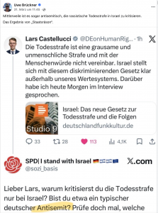 Was man dazusagen muss: Lars Castellucci (SPD) ist Beauftragter der Bundesregierung für Menschenrechtspolitik und humanitäre Hilfe im Auswärtigen Amt, und er hat sich auch nicht erst jetzt im Fall von Israel kritisch zur Todesstrafe geäußert. So gab er beispielsweise am 10. Oktober letzten Jahres, dem Welttag gegen die Todesstrafe, folgendes Statement ab: