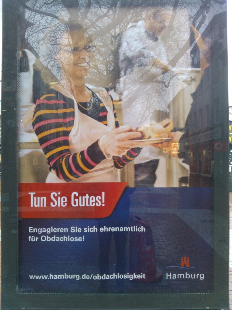 Bei uns in Altona (Hamburg) sprang mich kürzlich ein Plakat an, bei dessen Anblick mir doch gleich mal wieder eine laut gesprochener Kommentar entfuhr (obgleich ich allein unterwegs war): „Ich könnt ja so was von kotzen.“ Es wird gespart und demontiert, wo es nur geht (sowohl bei den Ländern als auch beim Bund): Gesundheitswesen, Sozialleistungen, Renten, Polizei … das Geld fließt dann lieber in Prestigebauten oder Banken und Konzerne (in Form von Steuererleichterungen und Subventionen). Und als sei das nicht genug, wird das Geld in eine Kampagne gesteckt, dass doch die Bürger bitte die hoheitlichen Verpflichtungen übernehmen mögen, die dem Staat eigentlich zufallen.