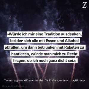 Dazu nur so viel: Ich finde, dass individuelle Freiheit da eingeschränkt werden sollte, wenn sie die Freiheit von anderen Menschen massiv beeinträchtigt. Und das ist beim Silvesterböllern eben massiv der Fall.